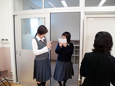 久しぶりの体育朝礼です。後期生徒会役員になってからは初めての体育朝礼、生徒会長が朝礼台の上で指示を出しています。聖歌、ラジオ体操の後、先日行われたスポーツ大会の表彰式が行われました。 高校入試説明会が行われました。説明会のあとは国語の体験授業です。詩の世界に参加者を誘った(いざなった)あと、施設見学、ティータイムという運びになりました。学園長先生から本日の参加者にローマからのプレゼントが配られました。その後はクラブ紹介です。2007年度の入学式で皆さんと再会できることを楽しみにしています。 |