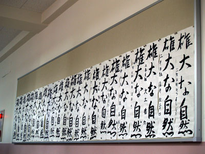 中学校は明日、授業参観ならびに学級懇談です。中学2年生のみ進路説明会が行われます。中学2年の廊下では学年の先生が冬休みの宿題の書初めを掲示していました。「雄大な自然」という文字が何枚も並ぶと圧巻ですね。