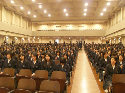 大阪の私立高校は本日軒並み入学試験を実施しており、城星学園高等学校もその1校です。朝早くから受験生が集まってきました。初めての高校受験ということもあるのでしょうか、受験生たちは緊張しているようです。受験生は講堂に集合し、そこでまず出席の確認です。入試委員長の先生から受験の諸注意を受けた後、係りの先生の誘導に従って受験教室へ移動していきます。さあ、まもなく受験開始です。受験生の皆さん、最善を尽くし、4月の入学式でまたお会いしましょう。