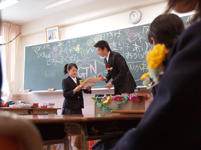 今日は2006年度の修了式です。2006年度のまとめにふさわしく、厳かな雰囲気のなかで式は進行していきました。修了式が終わったあと、今年度をもって本学園を退職する先生の離任式が行われました。一人ひとりの先生に生徒の代表から花束が手渡され、離任する先生からは、生徒たちにお別れのメッセージが送られました。