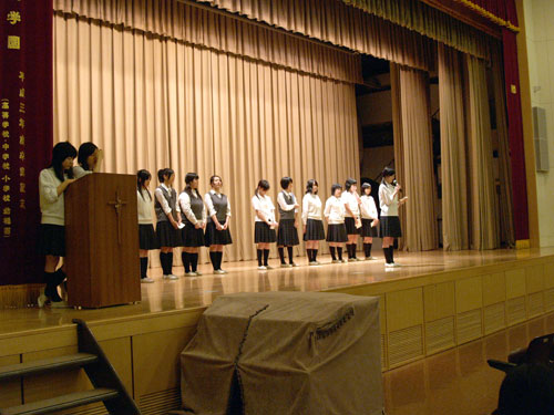 本日は、「おにぎりデー」の日です。なので、12:50から小聖堂にて祈りの集いが行われました。40名を超える生徒と10名以上の教員が集まり聖歌を歌い、聖書を読み、先生が話をして、しばしの沈黙(黙想)をし、祈りをもって終了するといった内容です。 今日の話は、「隣人を自分のように愛しなさい」というテーマに沿って行われました。話をした先生はかなり緊張した様子でした。祈りの集い終了後、先生に話を聞いてみたところ「いつも以上に緊張しました。授業でもこんなに緊張したことはないのに。」というコメントが返ってきました。日頃から生徒の視線を感じながら授業を行っている先生でも、場所や雰囲気が変わると緊張してしまうのですね。 |