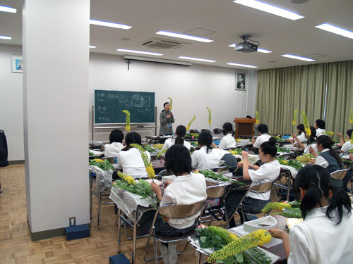 本日5,6時間目、高3の国際コースが生け花の授業を行なっていました。さすが高校3年生、落ち着いた様子で花を活けています。私(取材者)は5時間目の終了間際に取材に行ったのですが、ほとんどの生徒が花を活け終わっていました。やはり、4度目ともなると手際がよくなるんですね。