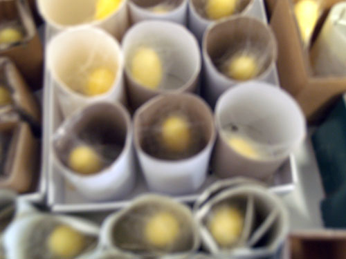 きれいな繭(まゆ)が出来上がりました。蚕は繭の中でさなぎになっているので、振るとカラカラと音がします。紙で部屋を区切って蚕たちが繭を作れるようにしましたが、繭ができたので部屋も取り壊して、繭を一つ一つ集めています。中には一つの繭に2匹の蚕がいるものもあるそうです。部屋を区切っていたのに寝相の悪い蚕もいるんですね。