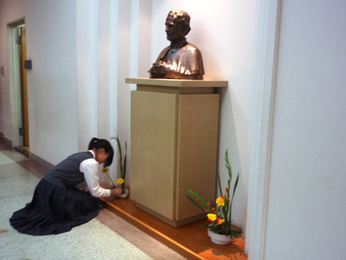 毎年6月の第1日曜日は高校の同窓会総会の日です。今年は今日がその日になります。10:30から例年のようにミサが行われ、それに引き続き今年は「昔夏しかの授業」ということで書道科の先生が「字をうまく書く方法」について、ユーモアあふれる授業を展開しました。