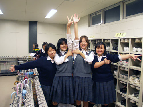 一方、小聖堂では、中間考査のために一時中断していたロザリオの祈りが再開されました。参加者は中学1年生が圧倒的に多いですね。こういった行事があるので、どこの取材に行こうかと思案し、ロザリオの祈りに決めました。途中、中学3年生とすれ違い、ピースをしてくれたので写真を撮りました。適当にシャッターを切ったのですが、かなりアップの写真になってしまいました。あわただしい昼休みのひと時でした。 中学2年A組の生徒の中には校庭ステージに出演する生徒もいるようです。ちょうど昇降口のところで生徒に遭遇、わざわざダンスのポーズまでしてくれました。そうなると写真を撮らないわけにはいきませんね。 |