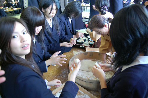 勉強合宿最終日、今日は1時間目の授業の後、餅つき大会が行われました。この餅つきが行われるようになって3年目、今年も餅つき奉行の先生が大活躍です。しかも、去年の餅つきで杵が少し欠けたのですが、その跡を発見、今年の卒業生の面影が先生方の脳裏に浮かびました。生徒たちは自分でついたお餅を自分たちで丸め、しょう油・黄粉・あんこなど好きなものをつけて食べていました。「餅つきするよりも早く家に帰りたい」と言っていた生徒たちもみんな夢中で餅つきをし、おいしそうにお餅を食べていました。