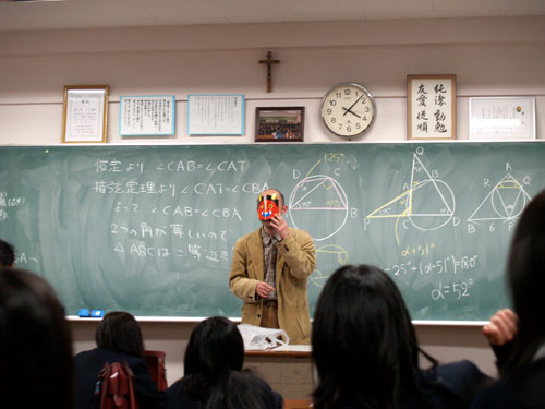 7時間目、授業を終え職員室に戻ると、机の上に「終礼のとき高1Cで豆まきをするようです」という特ダネメモが置いてありました。早速カメラをもって高1Cの教室へ向かいましたが、終礼が始まったばかりで豆まきが始まる様子がありません。そうこうするうちに高1Aの動きが少し怪しくなってきました。廊下の私(取材者)を伺っています。そしてついに声がかかりました。「鬼になって」と。もちろん私の返事はYesです。豆のシャワーを浴びることになってしまいましたが、中学生の時に2年間関わった生徒と再びこういうことで関わることができるなんて、嬉しい限りです。