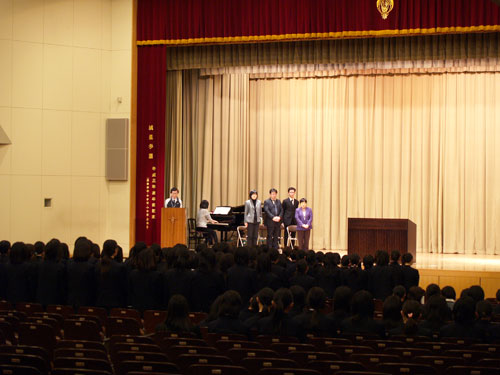 卒業生が会場の暖かい拍手に迎えられ、卒業式が挙行されました。校長先生から1人1人に卒業証書が手渡されます。卒業生代表によって答辞が読まれました。でも城星学園に対する感謝の思いは94名の卒業生皆同じです。卒業生のすすり泣きの声も聞こえます。卒業生の頭の中を今までの思い出が走馬灯のように駆け巡っているのでしょう。「仰げば尊し」斉唱、記念品目録贈呈、祝歌、校歌斉唱の後、無事卒業式は閉式しました。この後は各クラス、マリア像前で卒業記念写真の撮影、そして謝恩会です。 |
