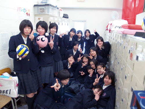 バドミントン部の撮影の後、バレーボール部のコーチと体育教官室前で会いました。部室で何かしているらしく、普段撮影することのないバレー部の部員の写真を撮ってほしいということでした。部室に行ってみると、人口密度の高いこと。まるで猿山の猿団子ならぬ、人込みの人団子です。先輩・後輩の絆の深さがこの様子からもうかがい知ることが出来ます。 |