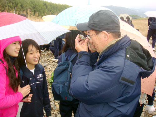 京都木津川では、お天気も回復してきました。講師の先生に天然石の見分け方を伝授してもらったとたん、皆で宝探しのように石を採集しました。ガーネット(ざくろ石)やトルマリン(電気石)、紅柱石など、さまざまな天然石を見つけ、観察、採集することができました。中学3年生は卒業まであと少し、また良い思い出ができました。 |