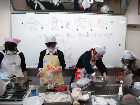 家庭科の授業の単元の中に「会食を楽しむ」というものがあるそうです。中学3年生は卒業をひかえているので、“卒業会食”ということで立食パーティーが行われました。グループごとに分かれていろいろな料理を作っています。調理室の真ん中には料理を並べるテーブルが設置され、まるでホテルのバイキングのようです。授業の合間の休憩時間に取材に行ったので、どのようなパーティーになったのか分らないのが残念で、連続ドラマの最終回を見逃したような気分です。でも、こんな調理実習は始めて見ました。これはすごいですよ。