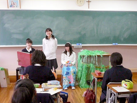 昨日、高1の一部の生徒は遅くまで残って勉強していました。帰る直前に職員室に顔を出した生徒の頭には新聞紙で折られた兜が、しかも前立ての部分には「愛」の字が。直江兼続ではないか。でも、時間が遅かったので昨日のホームページには間に合わず、1日遅れの記事になってしまいました。学校に残ってきちんと勉強する、そんな勉強できる環境があるのはいいことなのですが、保護者の皆さんが心配されるので下校時間はきちんと守らなければ。 3月3日はひな祭りです。高校1年生では、終礼時にみんなでひな祭りの雰囲気を味わえるように、ひなあられが一人ひとりに配られました。先生も「ちょっと塩がほしい」と言いながらおいしそうに食べていました。節分の時は鬼が現れましたが、今日はお雛様もお内裏様も現れませんでした。鬼はお面ですみますが、お雛様やお内裏様は十二単や束帯などの衣装が必要ですから、ちょっとむりでおじゃりまするなあ。あ、ちょっと昔の言葉使いになってしまいました。 中1の英語の時間におじゃましてみると、英語の教科書にある「不思議の国のアリス」の文を暗記し、各グループに分かれて思い思いの設定で演じていました。 あるグループは、前振りから本題、そしてオチというやはり大阪らしい構成をしているグループもありました。1グループ約3分ぐらいしかない量なのに、小道具が短時間で精巧に作られているのを見て、あらためてまとまりがあるなあと思いました。 その力を、テスト勉強にも活かして下さい。 本日昼休み、聖堂にて今年度最後の祈りの集いが行われました。今年度も祈りの集いに皆勤した生徒もいるようです。来年度も祈りの集いに積極的に参加してください。 |