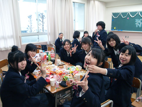 ドン・ボスコ広場に中学生のテニス部員が集合していました。新しいウェアを着ています。顧問の先生が「むっちゃカッコええやん」と絶賛。とても強そうに見えます。でも見掛け倒しじゃないですよね。もし負けらた、この新しいウェア、「回収」になるそうです。テニス部の生徒たち、自分たちで話に落ちをつけてくれました。 中学3年生は、卒業式が終わったあと、教室で茶話会です。私(取材者)が取材に行ったのは1時半をまわっていましたが、まだ食べています。でも中学生としてクラスの友達と教室で食事をするのもこれが最後、中学校生活を最後の最後まで楽しんでください。 食事のあとは、各クラスそれぞれの催し物で盛り上がっているようです。ロシアンルーレットをしているクラス。駄菓子エリア、スナックエリアというふうにおやつを並べているテーブルを分けてあるクラス、駄菓子エリアはおつまみになりそうなものがたくさんありました。また、お題を見てグループごとに劇を演じているクラスもありました。「3.13トイレ通り魔連続殺人事件」赤い風船を血になぞらえたり、教室にあるものを小道具に使いながら面白い劇を演じていました。 |