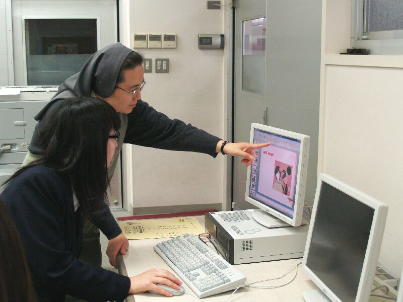 コンピュータ室でラウラサークルのメンバーがパソコンでなにやら作業をしていました。シスターがモニターを見ながら、生徒たちに的確な指示を出しているようです。シスターと生徒たちの合作のパワーポイントが、新年度の部活動紹介のときに講堂で映し出されることでしょう。他のクラブは部活動紹介の準備をしているのでしょうか?