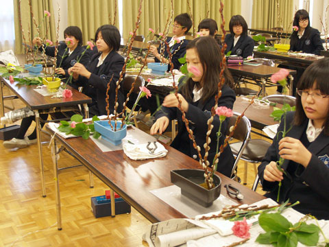 3・4時間目、中学1年生が生け花の授業を受けていました。中学に入学してから3度目の生け花です。少しずつ手際もよくなってきたようで、2時間続きの授業ですが1時間目の終わりでほとんど生け終っていました。一度体で覚えたことはなかなか忘れないということですね。 |