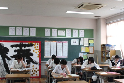 期末試験3日目、ついに折り返し地点に到達しました。少しずつ疲れも蓄積されてきたのか、放課後、靴箱を確認するとほとんど上靴になっています。つまりほとんどの生徒が下校しているということです。でも、何人かは教室に残って勉強しているようなので、カメラを抱えて取材に向かいました。ある教室には4人の生徒が残っていて、それぞれ勉強に励んでいました。息抜きに少しおしゃべりもしたりします。彼女たちが言うには「ピーマンの苦味がわかってこそ大人」なんだそうです。ピーマン嫌いの私(取材者)はまだまだお子様ということでしょうか。くだらないおしゃべりの間にどんどん勉強を進めていく生徒たち、自分の勉強スタイルを確立しつつあるようです。さすが高校生ですね。