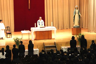 城星学園の創立記念日を知っていますか。12月8日です。本校では創立記念日に近い土曜日に創立記念ミサを行っています。聖書朗読、共同祈願、徳の花のカードの奉納など、ミサが粛々と進行していきます。聖体拝領では信者が聖体拝領するだけでなく、信者でない人も神父様から祝福を受けていました。今回のミサではかなりの数の人が祝福を受けたのではないでしょうか。今年は東日本大震災という大きな災害があった年です。東北地方の被災者にも心を留めながら、本日のミサを無事に終了することができました。 ミサの後は、生徒会主催で感謝の集いが行われました。日頃お世話になっている校長先生をはじめ、事務室の方、用務員の方、守衛室の方など、生徒たちが気持ちよく学校生活を送る上で大切な役割をになっておられる方に感謝のメッセージと花束を手渡ししました。 |
