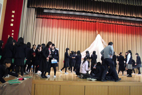 昼休み、宗教委員が職員室前に集まってきました。各クラスの徳の花のカードをリボンでくくり、集めています。明日の創立記念ミサで奉納されます。明日のミサはどのような感じで進行するのでしょうか。 放課後、明日のミサでの係にあたっている生徒が講堂に集合していました。客席やステージなど、係りごとに分かれて担当の先生の指示を受けています。明日の創立記念ミサが無事に終りますように。 |
