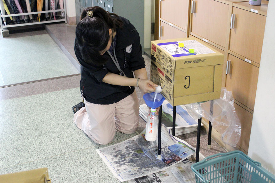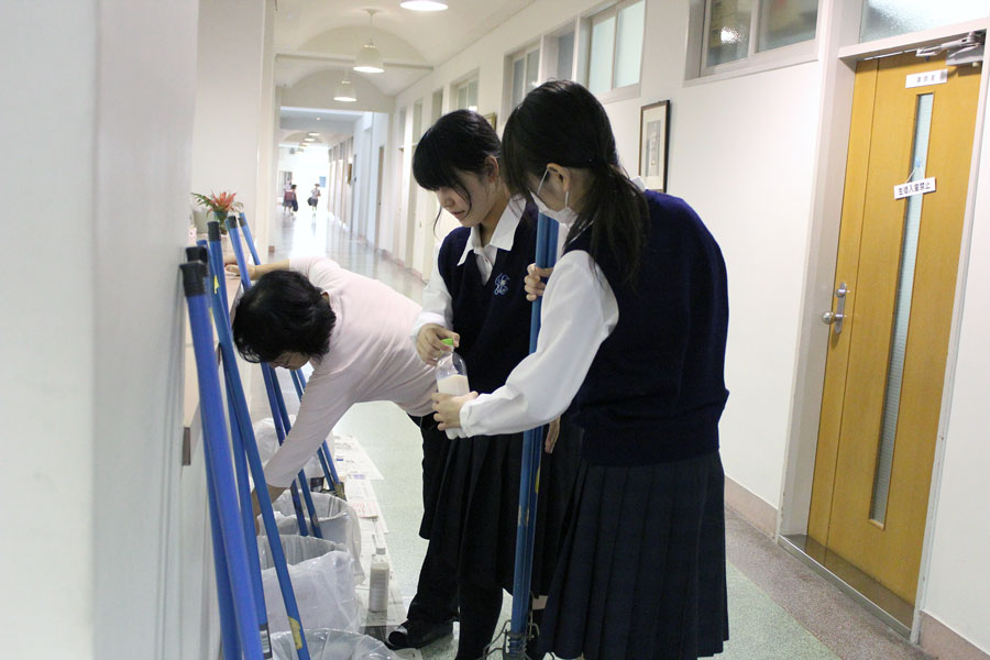 期末テストも最終日を迎えました。最終日には大掃除が行われます。先日高校がワックスがけを行いました。今日は中学校がワックスがけを行います。美化担当の先生がワックスがけの準備を職員室前でしています。じょうごやペットボトルを使って各クラス均等にワックスを配布できるように工夫をしています。生徒たちは明後日はピカピカの教室で答案を返却してもらうことができると思います。