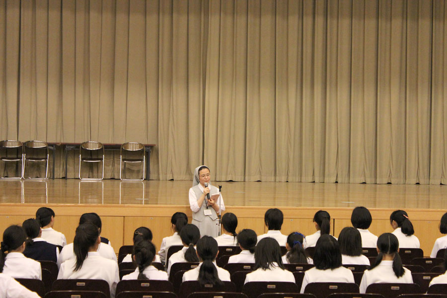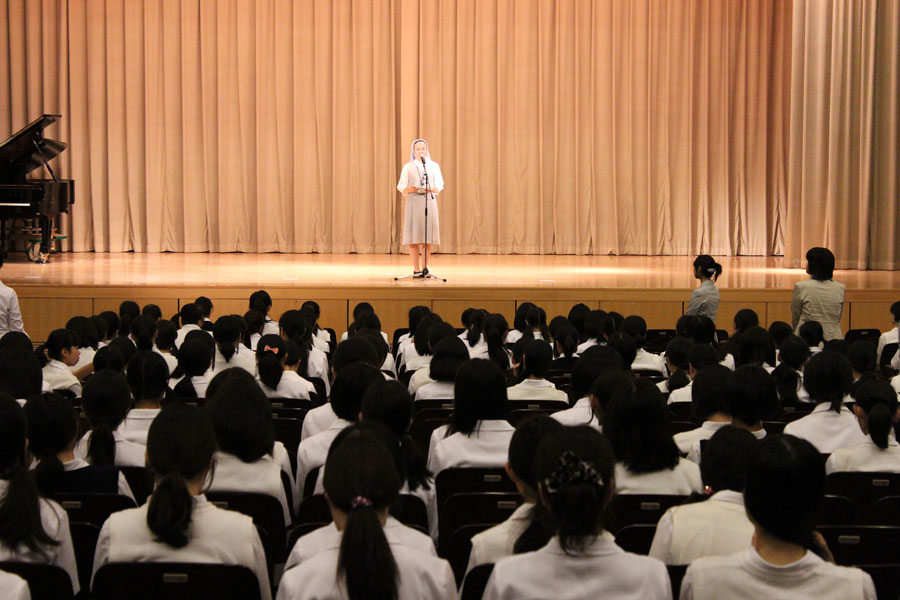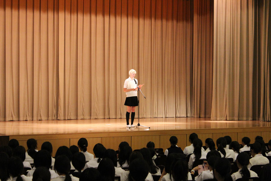 ドイツからの留学生が7月末に帰国します。中高の生徒全員の前で話す機会はこれが最後なので、スピーチをしてくれました。