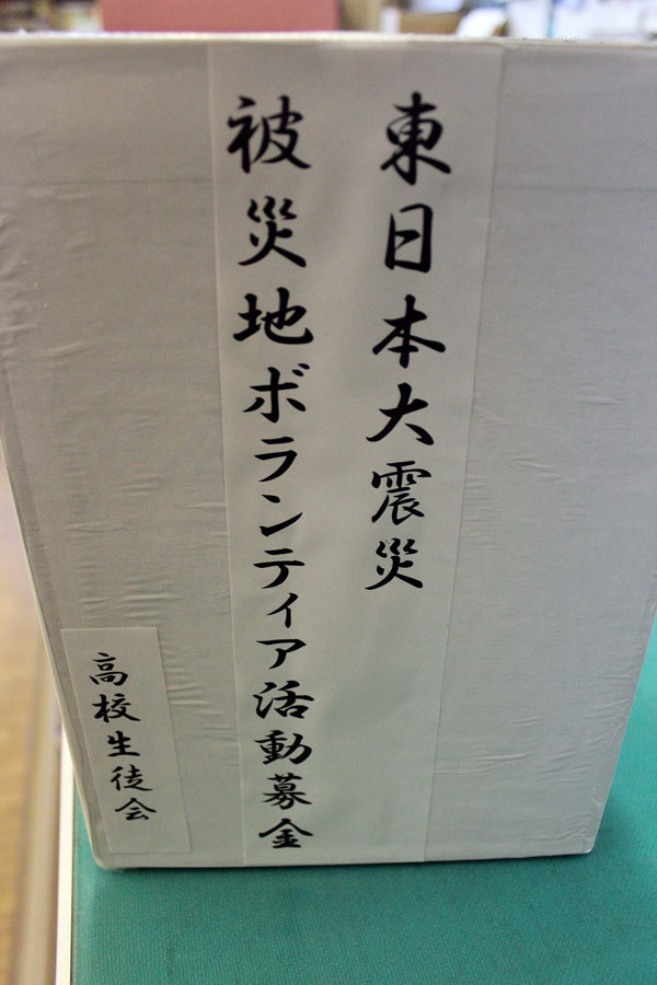 募金のご協力のお願いということで、生徒と保護者の皆様宛のプリントが配布されます。生徒会役員の生徒が現地で奉仕活動を行いますが、費用支援の募金を行わせていただくということです。保護者の皆様は、本日生徒が持って帰ったプリントをご確認ください。募金箱も生徒会の先生がしっかりとしたものを作っています。裏にはちゃんと取り出し口もあります。目安箱のように、この箱は将軍様いや校長先生しか開けることができないのでしょうか。たくさんの募金が集まることを期待しています。