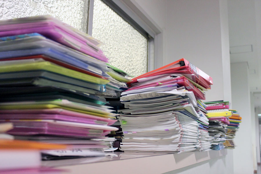 期末考査が終り、職員室前の棚の上は提出物でいっぱいです。物を置く隙間もないぐらいに提出物が出されています。係の生徒は定期的に確認に来てください。チェック済みと書かれている提出物もたくさんありますから。