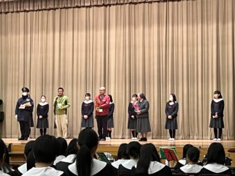 生徒会長の司会のもと,みんなで聖歌を歌い校長先生のお話を聴きました。