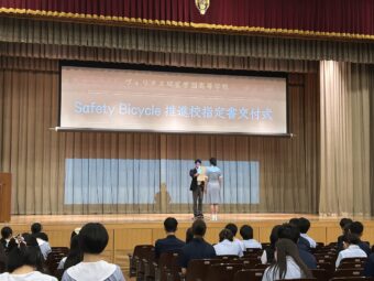 さて、終業式終了後、大阪府教育庁保健体育課、大阪府警察本部交通部、大阪東警察署の方にお越しいただき、「Safety Bicycle推進指定書交付式」を行いました。