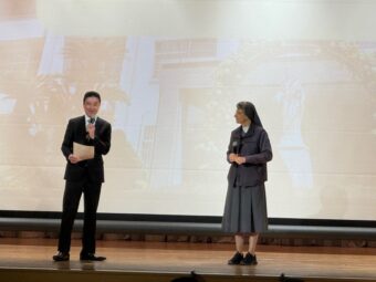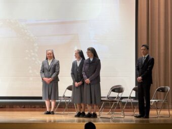 小学生からは、英語のあいさつとともに花束を手渡し、元気あふれる聖歌とダンスでシスターをお迎えしました。高校生からは、イタリア語と英語でのあいさつに続き、献金が行われました。その後、シスターご自身から「若者と共に歩む」教育のスタイル、すなわち「先を行く」のではなく「隣に立って共に進む」というメッセージを、熱くそして優しくお話しいただきました。