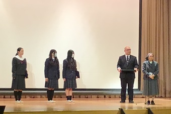 校長先生のお話のあと、税の作文と「話してみよう韓国語 大阪大会」の表彰式を行いました。