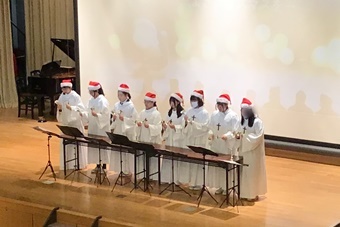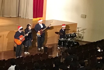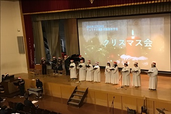 聖歌隊、軽音楽部による演奏、ホセ神父様のお話、み言葉のカードのプレゼントなどがあり、最後は全員で「もろびとこぞりて」の合唱で締めくくりました。