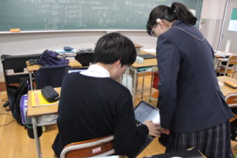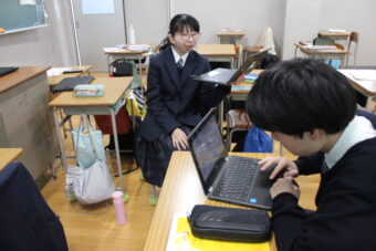 高校1年生の学びの森です。「マニフェストを作ろう」の授業にお邪魔しました。欠席者がいたので、今日は2人だけの授業になります。衆議院の解散や野党の動きなど、選挙にかかわる動きがありますね。もし、皆さんが立候補するならどのようなマニフェストを作りますか。来週から2週間にわたって、各自のマニフェストを発表してもらいます。この中から次代を担う政治家が登場するのでしょうか。