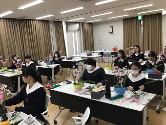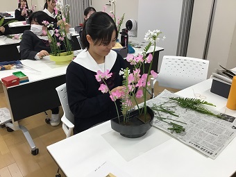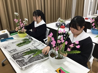 今日は2年生が生け花の授業を受けました。「ならぶ」形に初めて挑戦しました。剣山を2つ用いて、空間をうまく使い表現する方法です。それぞれの感性で、上手に花を活けていました。スイートピーが春を思い起こさせてくれて、ほっとできる空間でした。