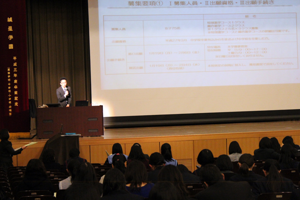 学校長からの挨拶、教頭から教育施策についての説明の後、入試のポイントについて説明を行い、