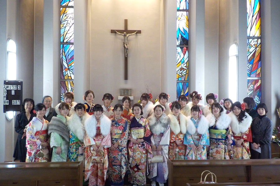 学園では、学校生活を共に送ったなつかしい友人や当時の担任の先生方が集まり、楽しいひとときを過ごしました。晴れ着姿はまぶしく、華やかで、お互いに「可愛い!」と褒め合っていました。会の終わりに、学園聖堂に集まり、これまでお世話になった方々への感謝と、これからの一人ひとりの人生の歩みのうえに神様の祝福を願い、「新成人の祈り」をお捧げました。先生方からは、お祝いと励ましのメッセージをいただきました。