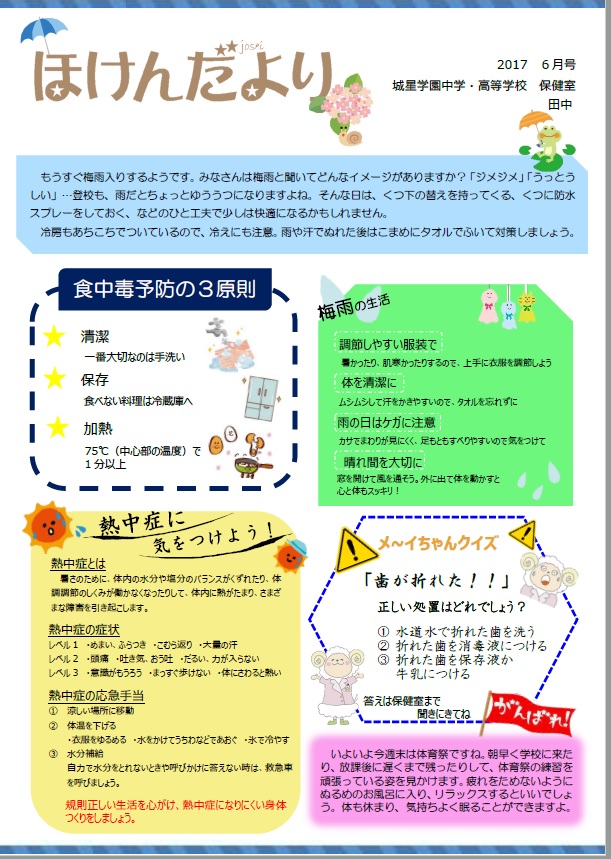 今月のほけんだよりは、梅雨や熱中症対策についての内容です。
