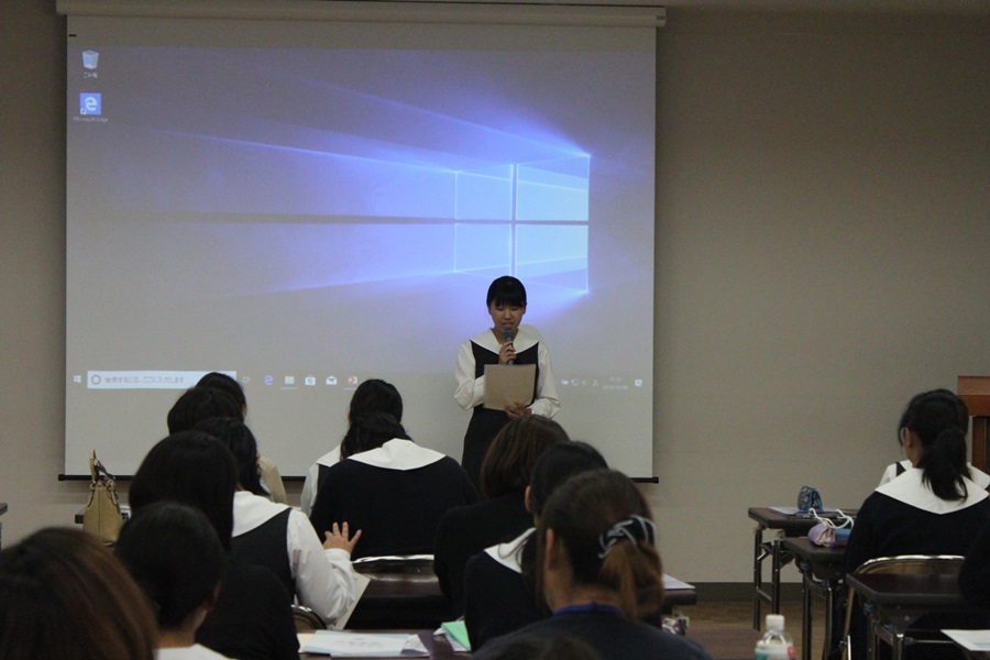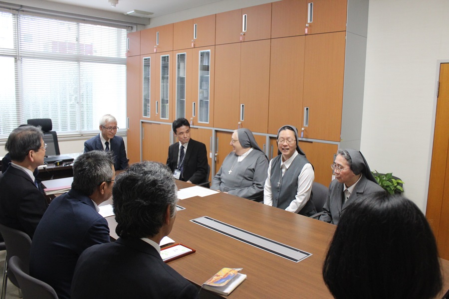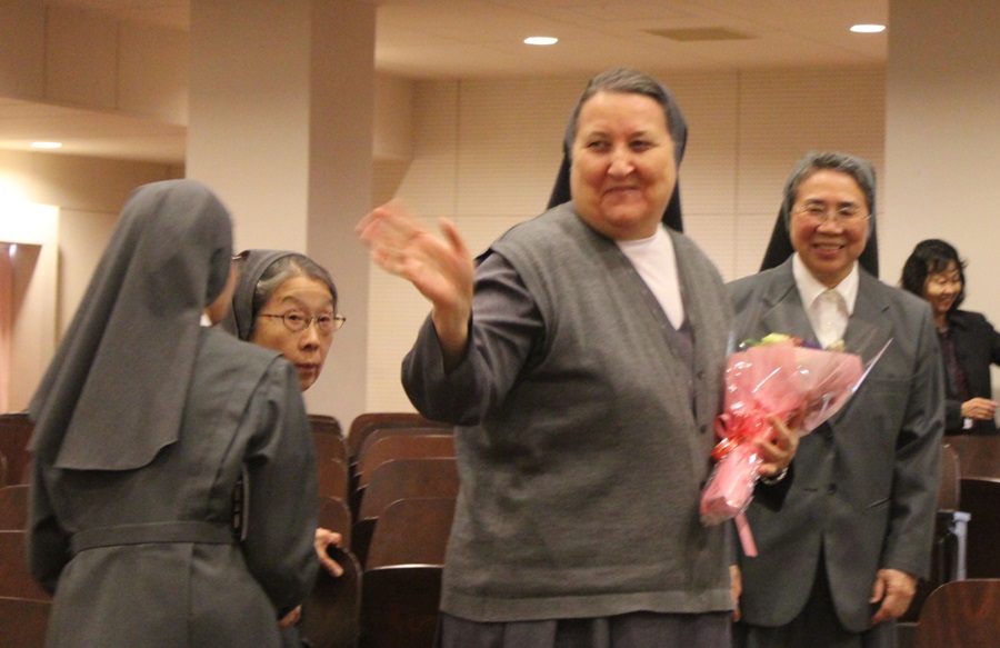 教職員によって、Sr.フィリスの公式訪問歓迎会が行われました。校長先生がSr.フィリスの紹介をしてくださり、理事長先生の歓迎のあいさつ、幼稚園園長先生から花束の贈呈があり、シスターからお言葉をいただきました。シスターは歓迎会が修了した後も、ドン=ボスコ広場にいる中高生とお話をされていました。