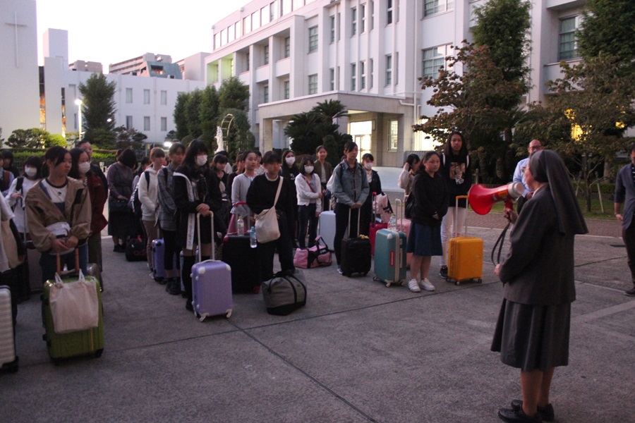 学びの森合宿を終えて、高校1年生が帰ってきました。5時半という時間だったので、外も薄暗くなっています。校長先生をはじめ、多くの先生方が高校1年生が帰ってくるのを待っていました。明日は休みです。1日ゆっくり休んで、金曜日からの授業にそなえてほしいと思います。