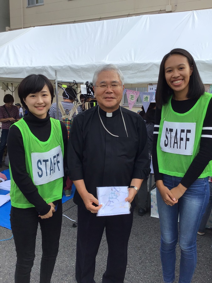 当日は天気にも恵まれ、篤子さんのお計らいで与らせていただいだ11時からのミサも満席でした。英語・韓国語・フィリピン語・中国語・ベトナム語などさまざまな言語が話され、とても豊かで厳かなものでした。その後は、中央の舞台では民族舞踊やダンス・コーラスをはじめ華やかな催しがなされ、その周りのテントでは各国の食べ物、物産、手作りの品々が売られており、休憩時間は楽しく時を過ごしました。私たちは4グループに分かれ、それぞれ「ゴミ回収」「子どもとの交流」、そして自分たちが前日に作った「スコーン販売」をしました。2時間ほどで売り切れました。売り上げは台風19号で被害を受けた方々に送金したいと思います。