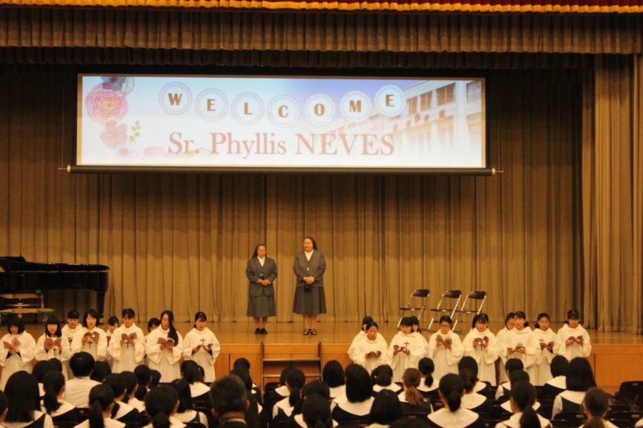 講堂朝礼でSr.フィリスの歓迎会が行われました。シスターが聖歌隊の歌声が響く講堂に入場されました。生徒会の生徒から花束の贈呈などがあり、シスターからはメッセージをいただきました。また、日本語・英語関係なく伝えるために音楽に合わせて、面白い催しもしてくださいました。退場する時も、絶えず生徒たちに向かって手を振っておられました。