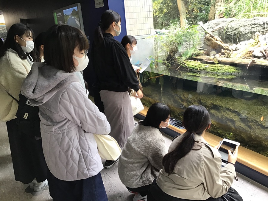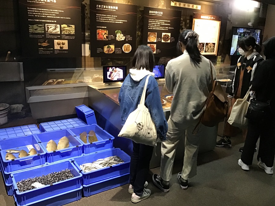 琵琶湖のそばの宿泊施設で合宿を行います。昼は各グループが事前学習で決めたテーマに沿って、琵琶湖博物館の展示物を見学しました。夕方には博物館の職員の方に講演をしていただきました。夜に本日の学びのまとめを行います。
