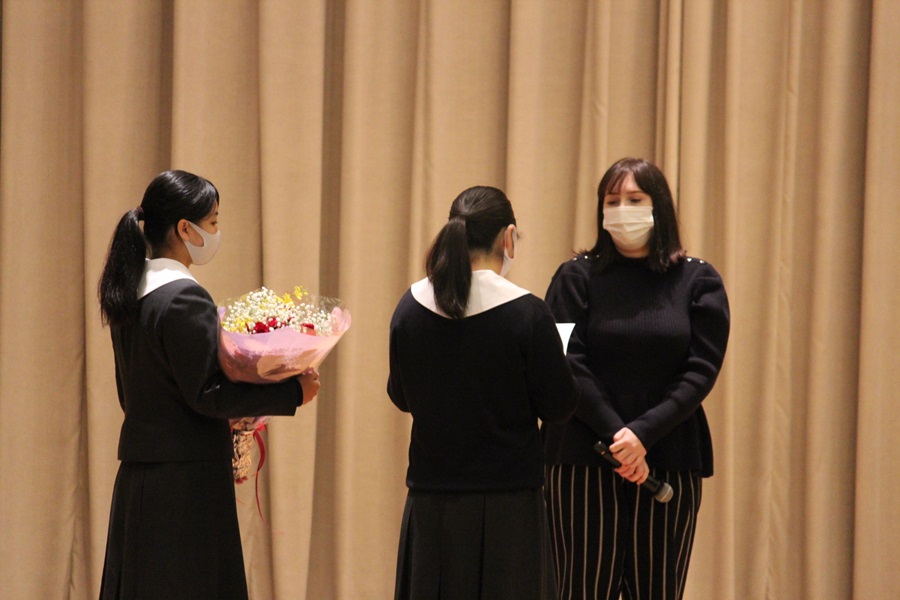 その後、5年間本校で「英会話」を担当していただいたローラ先生の送別を行いました。これまで多くの生徒が「楽しく」「気軽に」英語に触れることができるように、授業中でも放課後でも熱心に指導していただきました。本当にありがとうございました。イギリスに帰られてからも、元気に活躍されることを心から願っています。