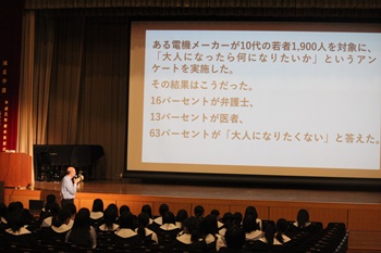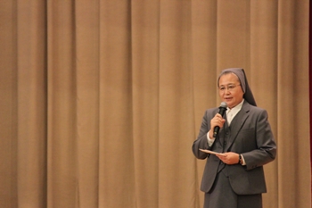 サレジアンシスターズの宮脇管区長様が来園され、中学・高校生による歓迎会が講堂で行われました。今朝のお祈りの人はびっくりしたのではないでしょうか。放送朝礼ではなく、このような大舞台でのお祈りです。大過なく勤めてくれました。